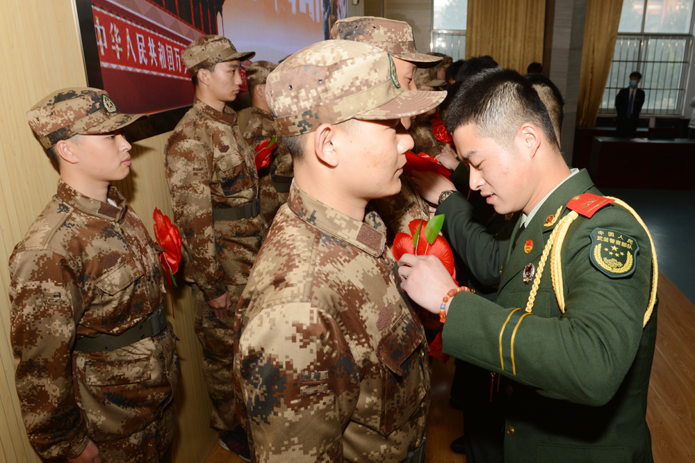 在“没有共产党就没有新中国”的乐曲中,与会领导为入伍学生颁发了纪念品,退伍学生为新入伍学生佩戴了光荣花。