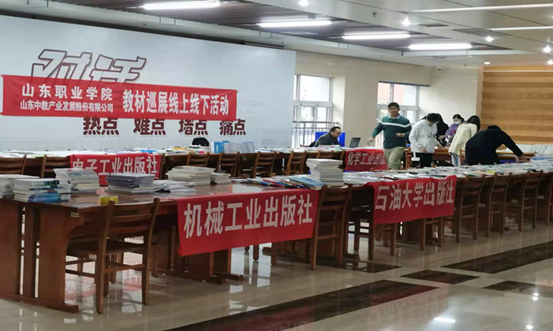 本次活动由我校和山东中教产业发展股份有限公司共同举办,依托“教材巡展网上行”服务平台同时开展线上线下巡展活动。参加本次线下巡展的出版社有科学出版社、清华大学出版社等10余家。现场重点展示了近三年出版的各类获奖教材、规划教材和精品教材3380多种。到场老师220多人,免费申请教材样书510多种。当天无法到现场选书的老师,也可通过“教材巡展网上行”平台申请获取教材样书。线上参展出版社达164家,其中赠送教材样书的出版社43家,可赠送教材样书品种170170种。