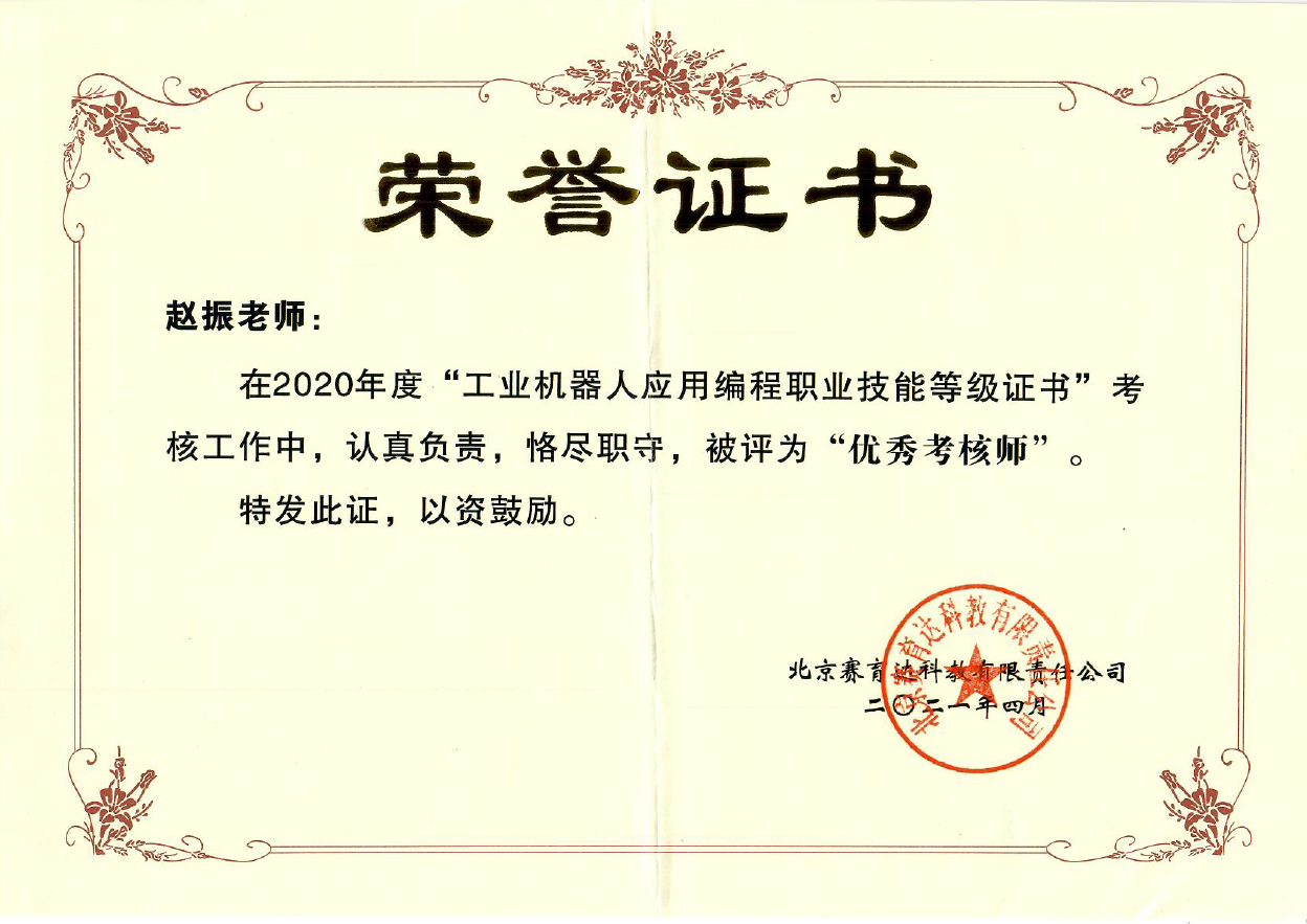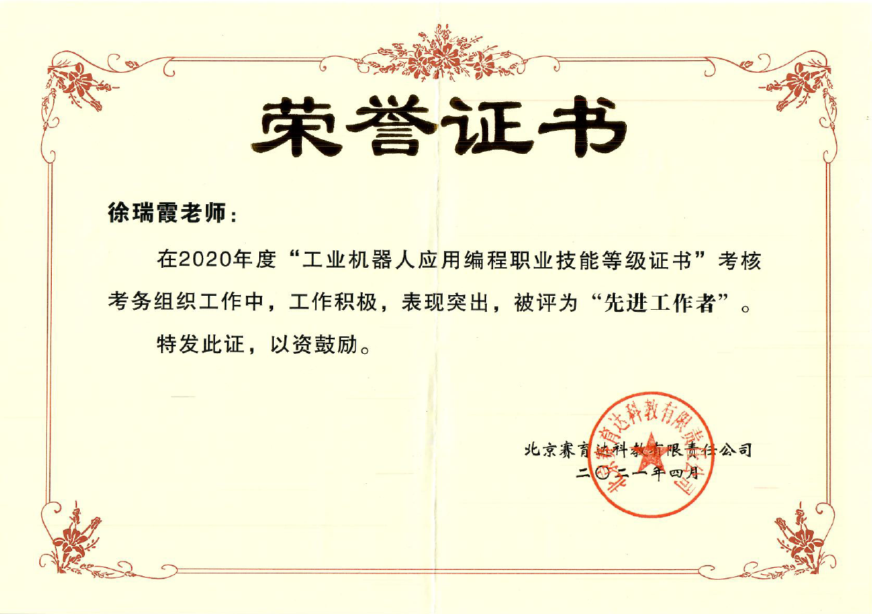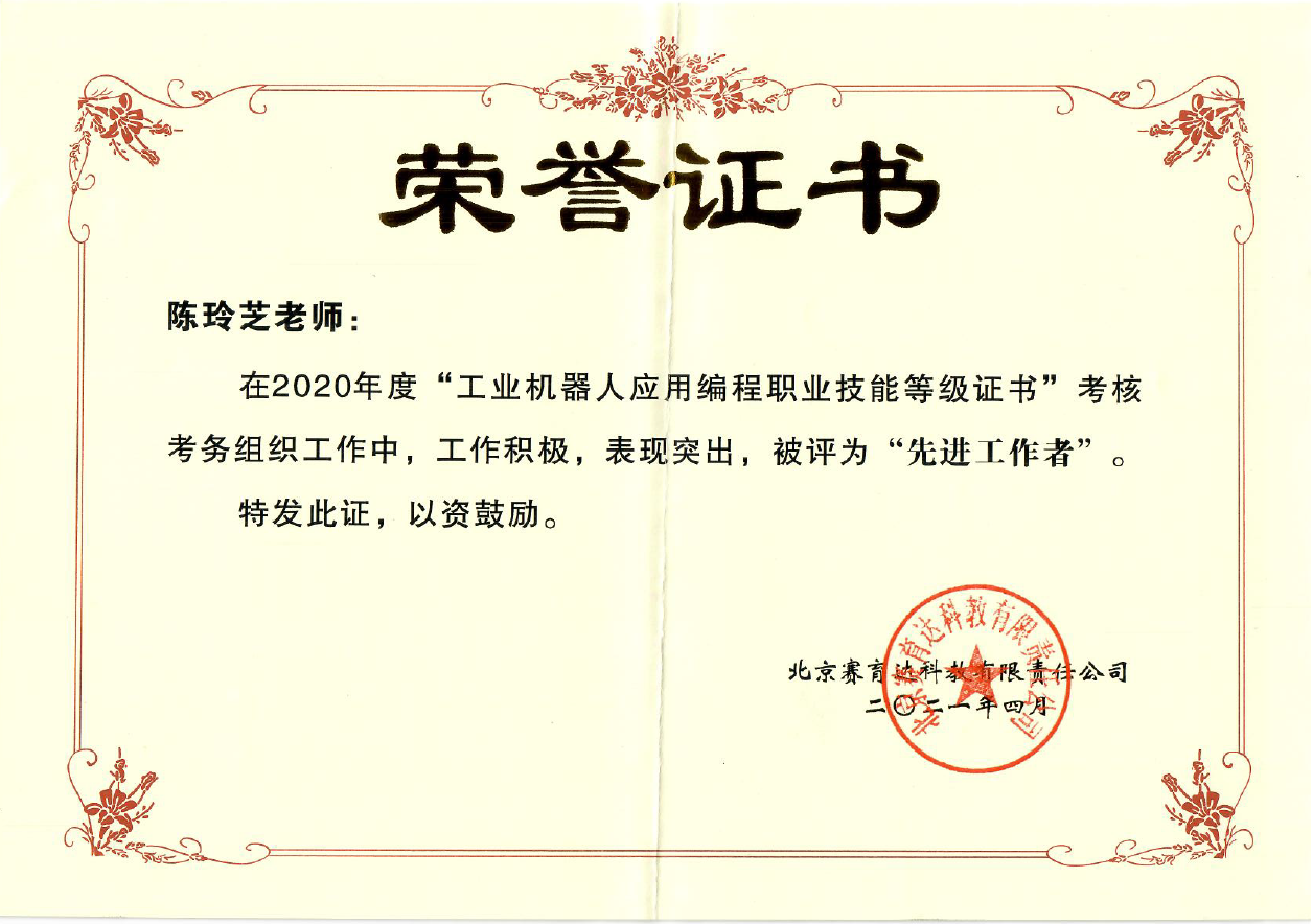 2020年,我校实施工业机器人应用编程1+X证书试点,与北京赛育达科教有限公司在推进书证融通、与学分银行对接、赛证融通等方面开展深度合作,为智能制造领域复合型技术技能人才培养搭建了良好的平台。我校也因在考务管理、师资培训、课证融通研究与实施等方面的突出工作,被授予优秀试点院校,徐瑞霞、陈玲芝和赵振三位老师分别被授予优秀考务工作者和优秀考核师。