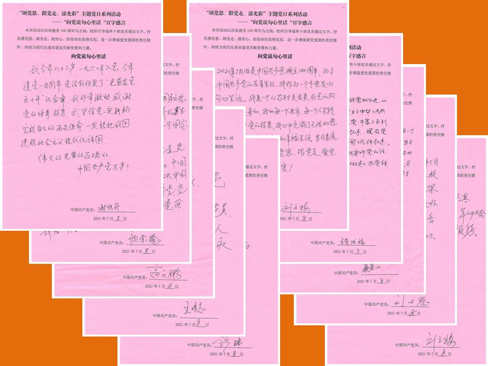 会议最后,各支部开展了“向党说句心里话”百字感言心里话活动。老同志结合党史学习教育,一笔一划写下对党想说的心里话,记录下对中国共产党成立百年的感言、对党的祝福。老同志们表示,只有祖国的强大,才能岁月静好,乐享生活,在新的历史时期,会一如既往的不忘初心、牢记使命,永远跟党走。