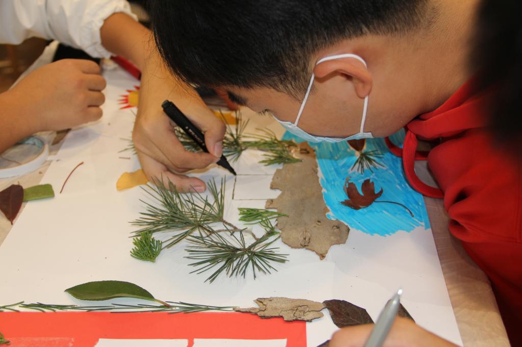 活动过程中同学们利用秋之落叶,绘冬之暖心事。剪、画、贴、写,尽情发挥想象力,相互合作,精心的制作着一幅幅充满梦幻色彩的作品。创作时同学们体验专注的自己,感受生命与艺术的融合,体验静心与艺术的魅力,共同创造心灵之美。