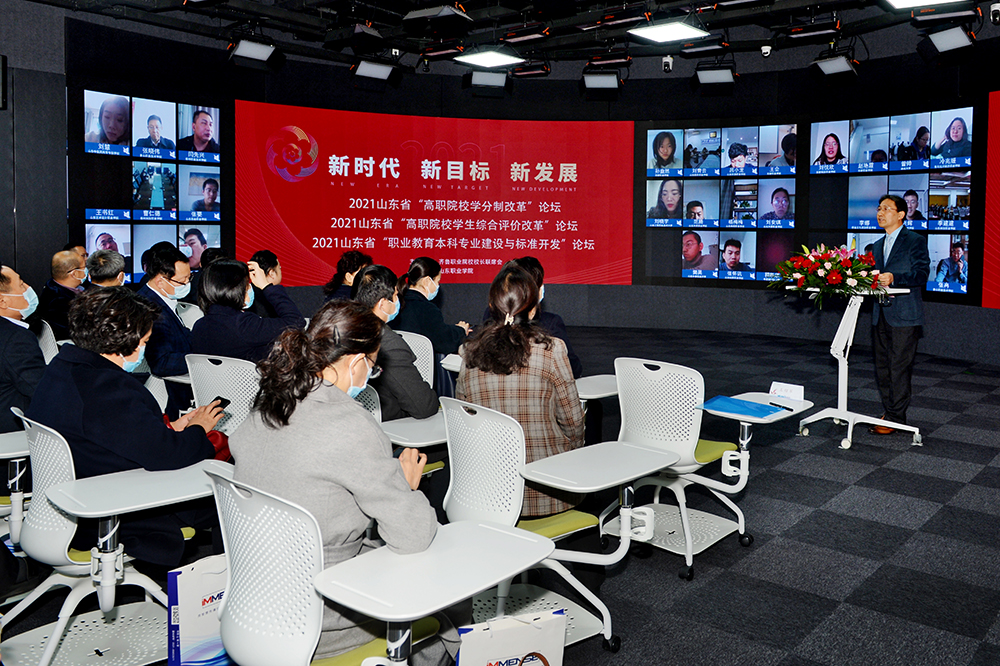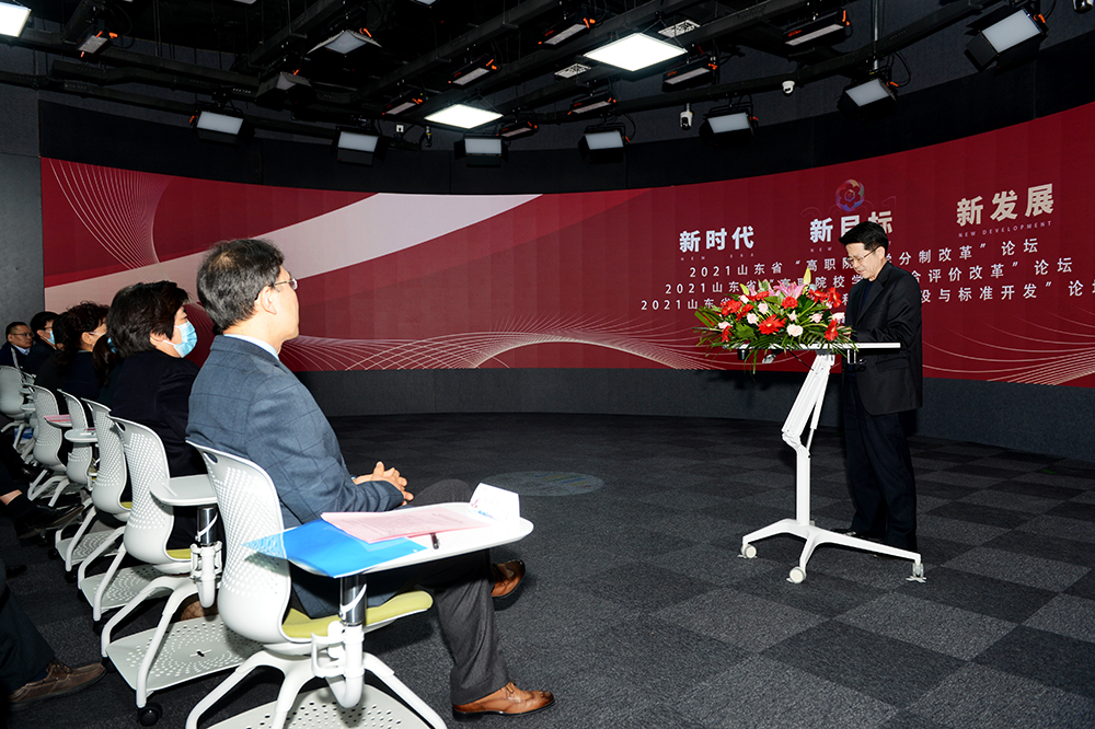 11月18日上午,由齐鲁职业院校校长联席会议主办、我校承办的山东省“职业教育本科专业建设与标准开发论坛”“高职院校学分制改革论坛”“高职院校学生综合评价改革论坛”三个论坛在我校新建成的全景教室开幕。院长秦河致欢迎辞,省教育厅职教处副处长陈志浩出席并讲话,全省各高职院校领导、教育教学管理人员、学生管理人员、专业带头人、骨干教师等通过线上线下相结合的方式参加论坛。开幕式由副院长王绍军主持。
