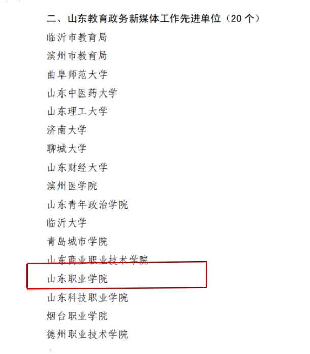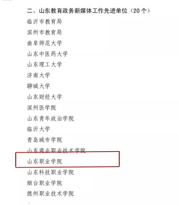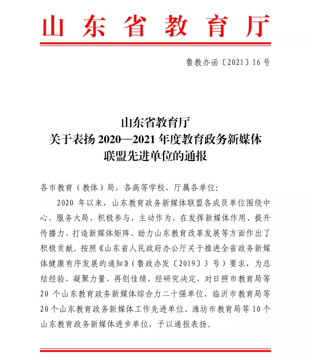 近日,山东省教育厅印发《山东省教育厅关于表扬2020—2021年度教育政务新媒体联盟先进单位的通报》,我校荣获“山东教育政务新媒体工作先进单位”称号。