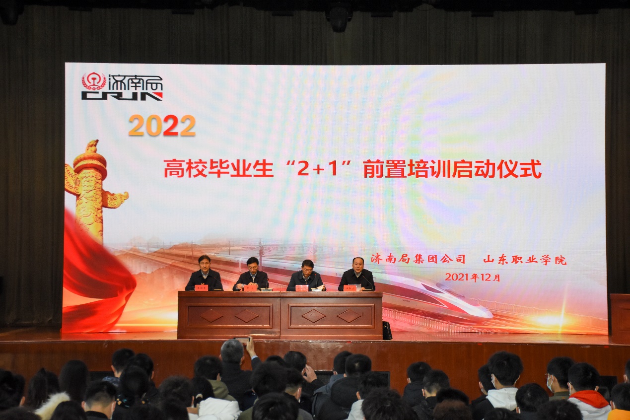 12月7日,中国铁路济南局集团有限公司2022年高校毕业生“2+1”前置培训启动仪式在我校南益馆举行。济南铁路局集团公司人事部(党委组织部)主任(部长)薛义,职工培训部主任张贺年,团委书记胡述沛,人事部(党委组织部)副主任(副部长)杜春虎,党校企业管理教研室主任、副教授赵祥刚,学校副院长王绍军出席活动。