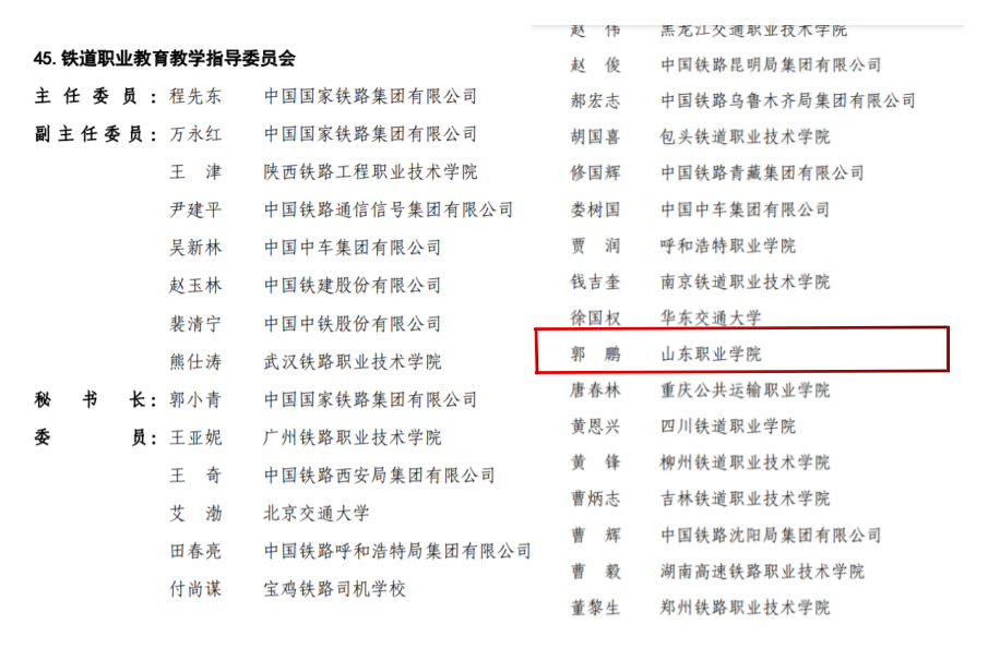 近日,教育部公布了全国行业职业教育教学指导委员会(2021—2025年)和教育部职业院校教学(教育)指导委员会(2021—2025年)组成人员,我校党委副书记郭培谦入选生物技术职业教育教学指导委员会委员,副院长郭鹏入选铁道职业教育教学指导委员会委员。