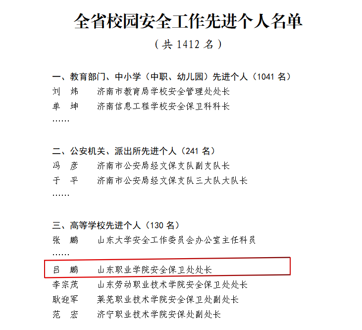 2月21日,山东省教育厅发布《关于2021年度全省校园安全工作先进集体和先进个人名单的公示》,我校获评2021年度全省校园安全工作先进集体,学校安全保卫处处长吕鹏被评为2021年度全省校园安全工作先进个人。