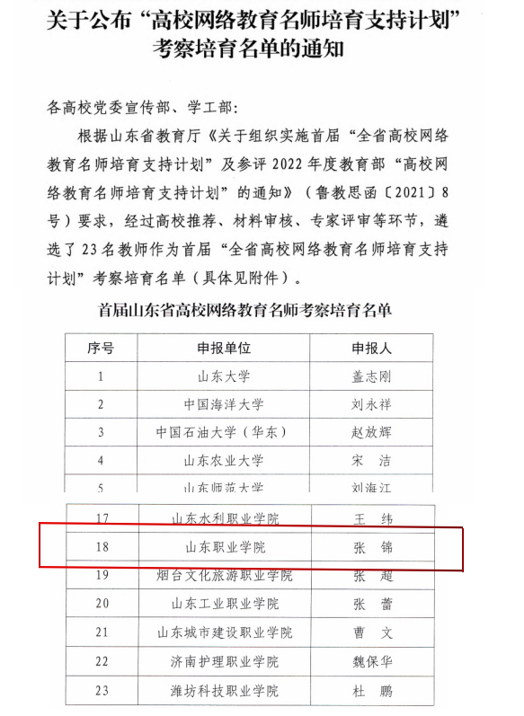 2月21日,山东省教育厅印发《关于公布“高校网络教育名师培育支持计划”考察培育名单的通知》,我校易安书院副院长张锦入选首届山东省高校网络教育名师培育支持计划考察培育名单。