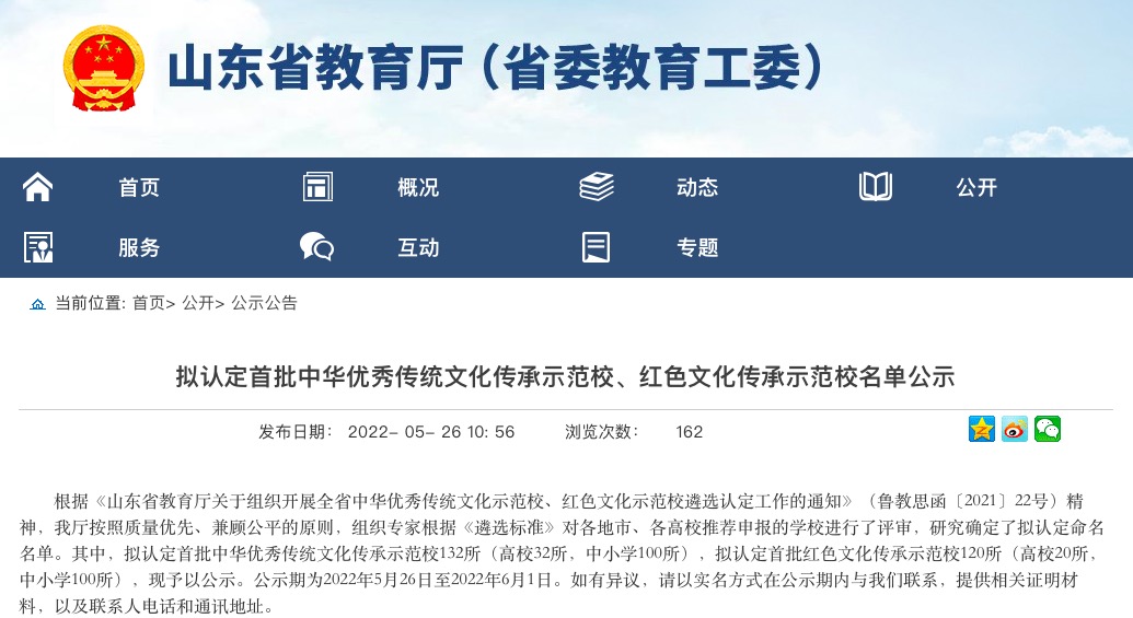 5月26日,山东省教育厅印发了《拟认定首批中华优秀传统文化传承示范校、红色文化传承示范校名单公示》,我校荣登榜单。