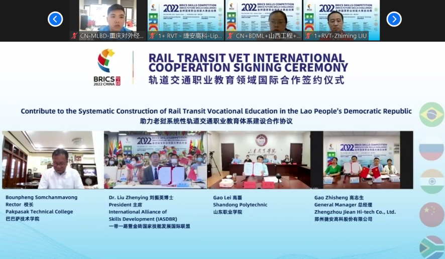 5月28日晚,2022金砖国家职业技能大赛闭幕式在厦门举行,会议通过线上线下相结合的方式召开,我校作为轨道交通职业教育领域国际合作签约单位代表应邀线上出席闭幕式并签署《助力老挝系统性轨道交通职业教育体系建设合作协议》。