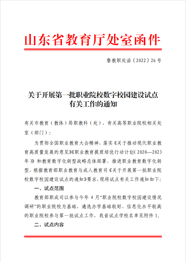 近日,山东省教育厅印发《关于开展第一批职业院校数字校园建设试点有关工作的通知》,遴选办学基础较好、信息化水平较高的职业院校作为第一批数字校园建设试点单位,我校成功入选。