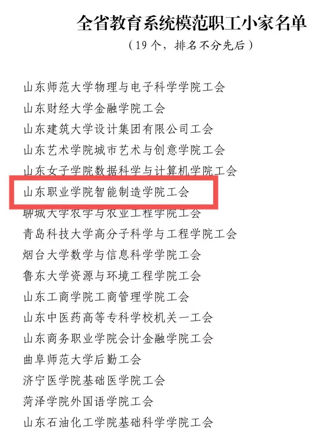 近日,山东省教育工会下发了《关于通报表扬全省教育系统模范职工之家模范职工小家和优秀工会工作者的决定》(鲁教工〔2022〕20号),我校智能制造学院支会荣获山东省教育系统“模范职工小家”荣誉称号。