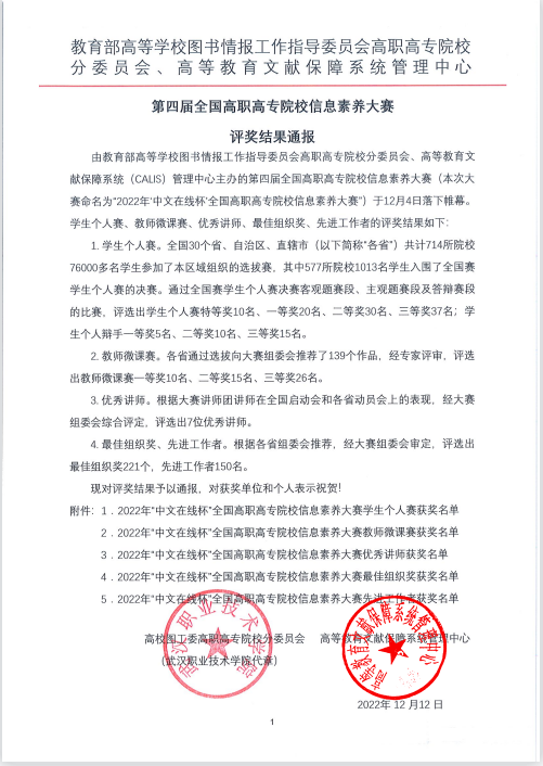 12月4日,2022年“中文在线杯”全国高职高专院校信息素养大赛决赛圆满落幕,由我校图书馆常威、龙腾指导的桐林书院2022级学生李骁哲,荣获一等奖。