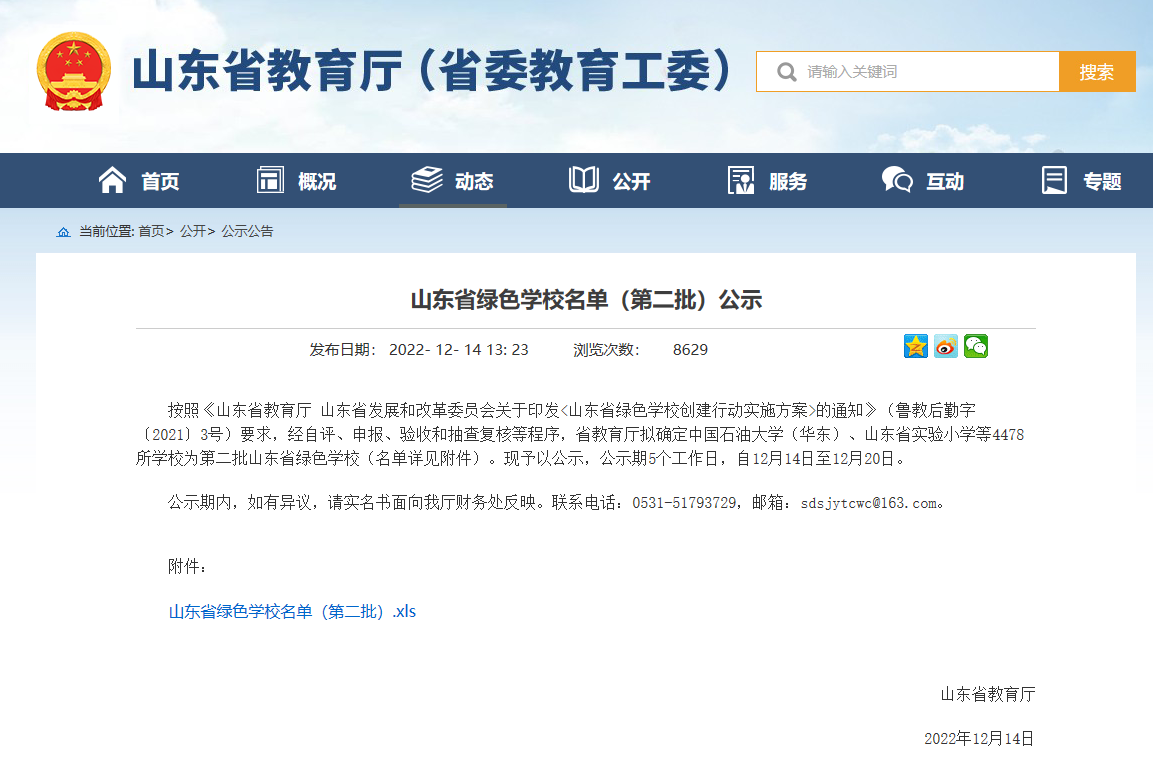 12月14日,山东省教育厅、山东省发展和改革委员会公布了第二批山东省绿色学校名单,我校成功入选。