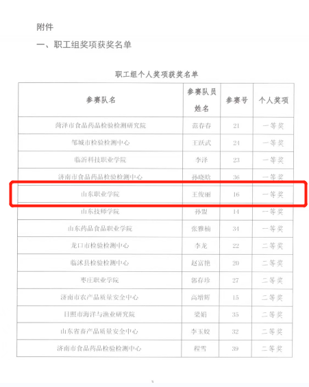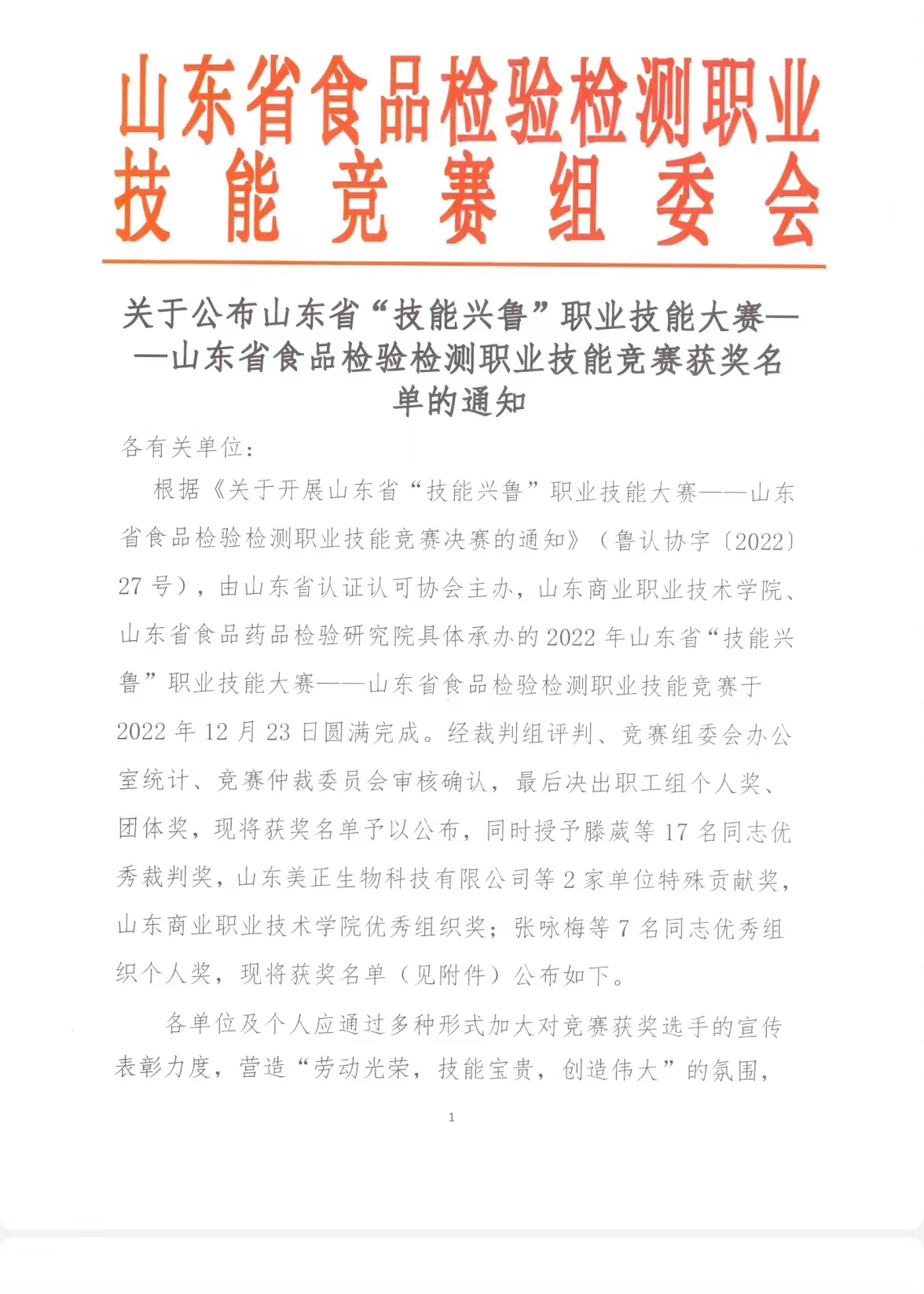 12月23日,由山东省认证认可协会主办的2022年山东省“技能兴鲁”职业技能大赛--食品检验检测职业技能竞赛圆满结束。我校生物工程学院王俊丽、邓凤霞两位教师参加了职工组比赛,分别荣获职工组个人一等奖和三等奖,学校参赛队荣获职工组团体二等奖。