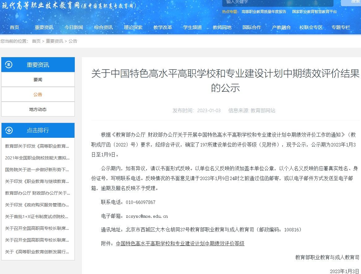 近日,教育部发布《关于中国特色高水平高职学校和专业建设计划中期绩效评价结果的公示》,确定了全国197所“双高计划”建设单位的评价等级,我校获评“优秀”等级。