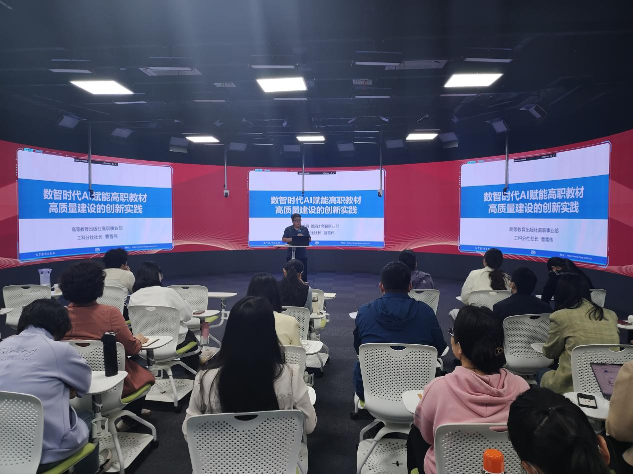 曹雪伟以《数智时代AI赋能高职教材高质量建设的创新实践》为题,从国家政策文件解读出发,对高质量教材的建设方法及出版推广进行了详细介绍,为教师编写教材提供了意见和建议。