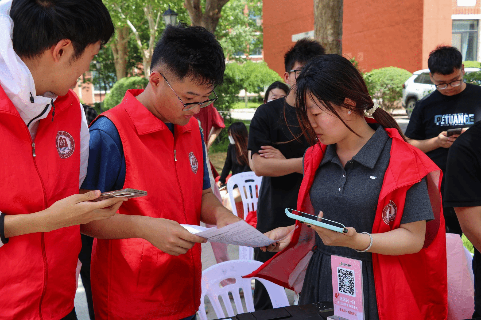 献血现场,一支身着红马甲的队伍格外亮眼——山东职业学院无偿献血志愿者服务队提前部署、周密安排,从场地布置到流程引导,每一个环节都安排得井井有条,为献血工作的顺利开展提供了坚实保障。