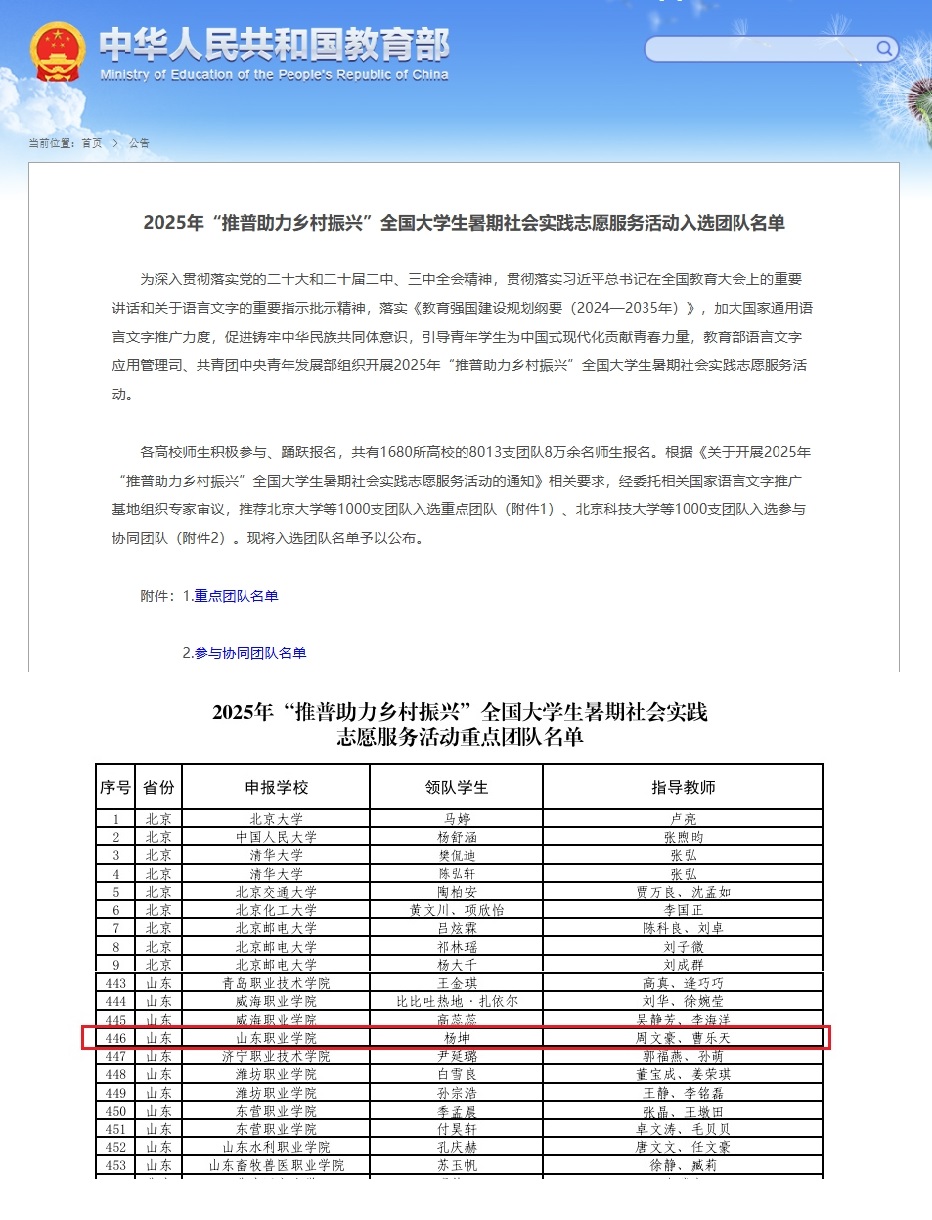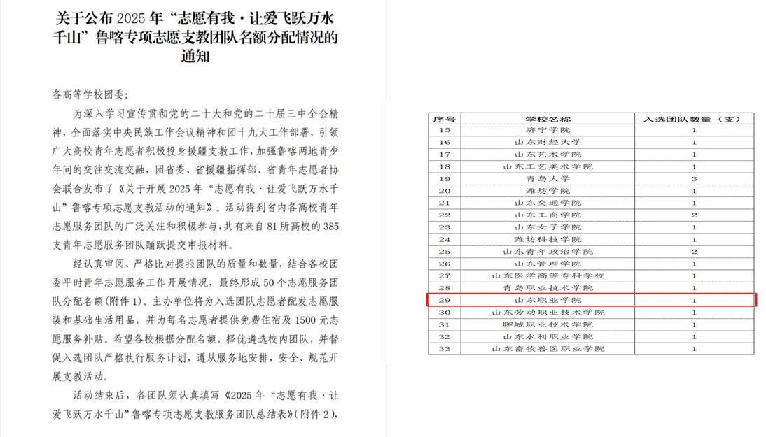 近日,《2025年“推普助力乡村振兴”全国大学生暑期社会实践志愿服务活动入选团队名单》和《关于公布2025年“志愿有我·让爱飞跃万水千山”鲁喀专项志愿支教团队名额分配情况的通知》发布,我校“山职号·喀什行”志愿服务队入选教育部2025年“推普助力乡村振兴”全国大学生暑期社会实践志愿服务活动重点团队名单,同时入选2025年“志愿有我·让爱飞跃万水千山”鲁喀专项志愿支教团队。