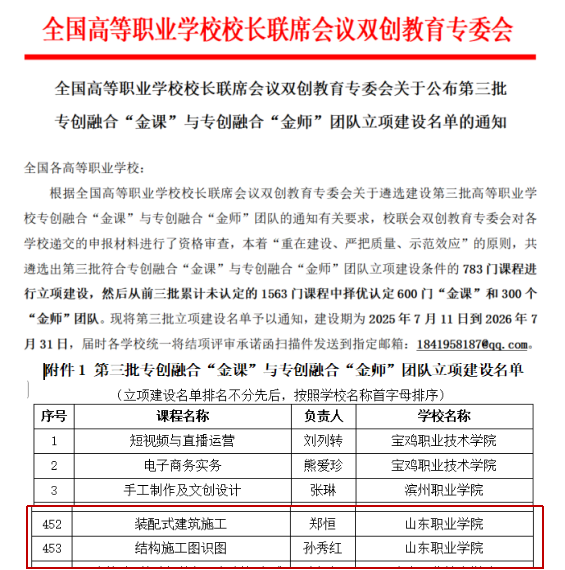 7月15日,全国高等职业学校校长联席会议双创教育专委会(以下简称“校联会双创教育专委会”)公布第三批专创融合“金课”与“金师”团队立项建设名单,我校土木工程学院的《装配式建筑施工》《结构施工图识图》成功入选。