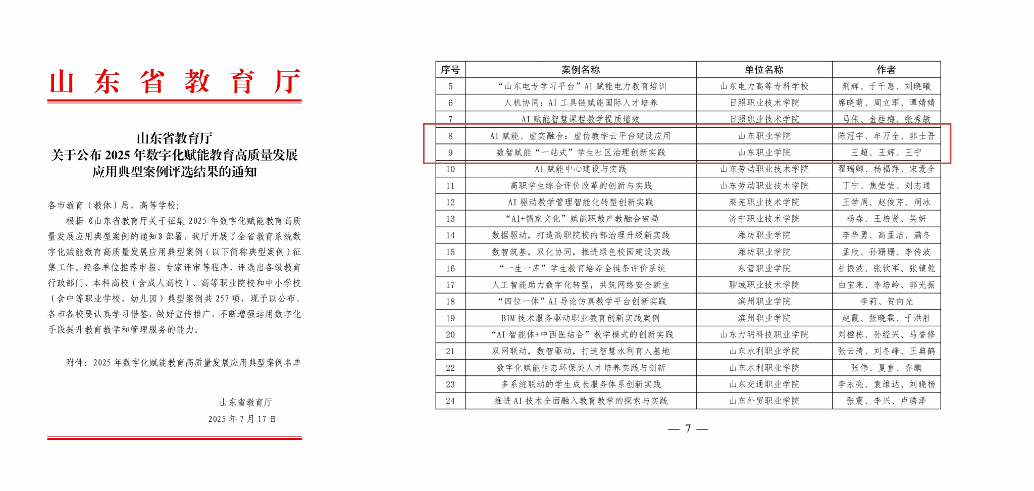 近日,山东省教育厅公布了2025年数字化赋能教育高质量发展应用典型案例评选结果,我校报送的《AI赋能、虚实融合:虚仿教学云平台建设应用》和《数智赋能“一站式”学生社区治理创新实践》两项案例成功入选。