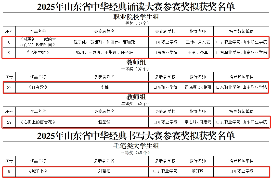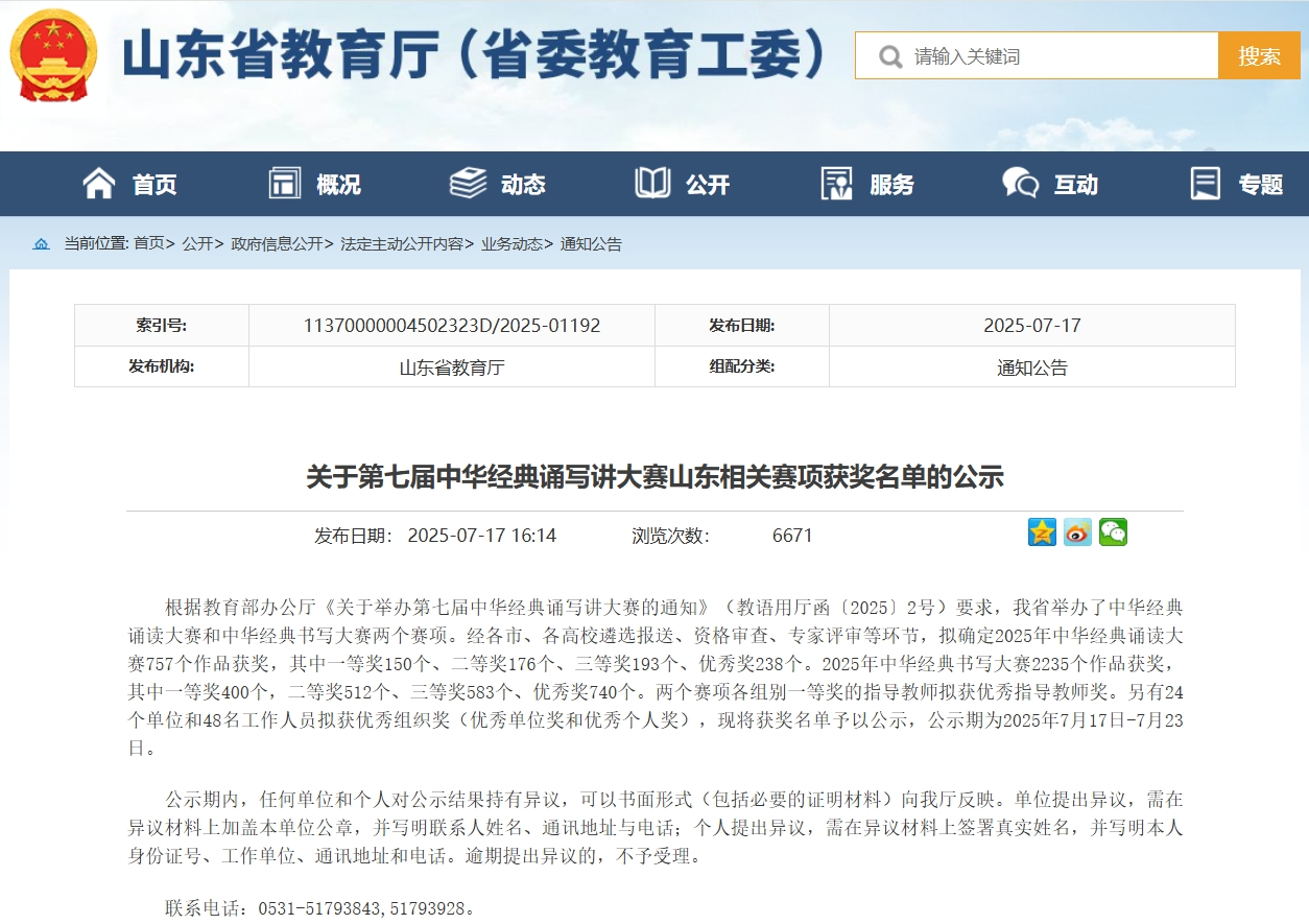 7月17日,山东省教育厅公示第七届中华经典诵写讲大赛山东赛项获奖名单,我校师生作品在激烈竞争中脱颖而出,共获一等奖3项、二等奖1项、三等奖1项。