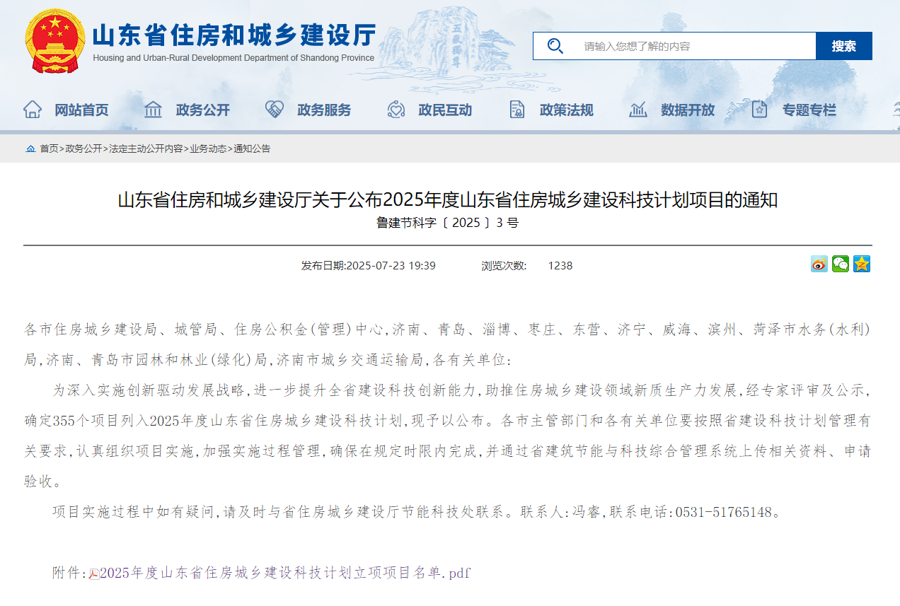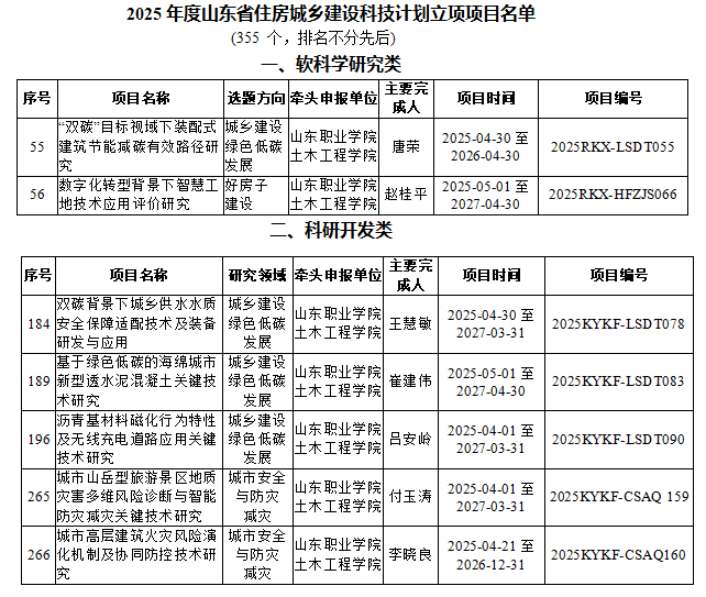 近日,山东省住房和城乡建设厅公布了2025年度山东省住房城乡建设科技计划项目立项通知,我校7项课题获批立项,课题涵盖城乡建设绿色低碳发展、好房子建设、城市安全与防灾减灾等领域。