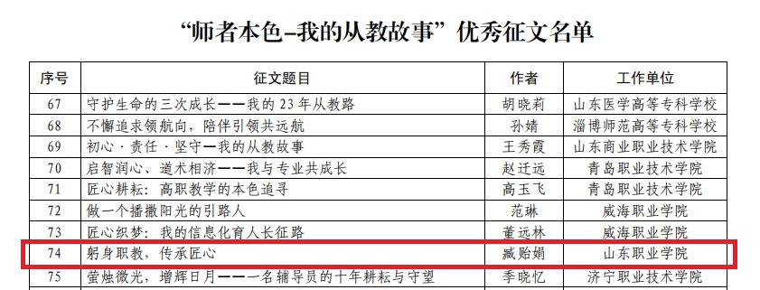7月22日,山东省教育厅发布《关于公布“师者本色——我的从教故事”优秀征文的通知》,我校智能制造学院机械制造及自动化专业教师臧贻娟的《躬身职教,传承匠心》获优秀征文。