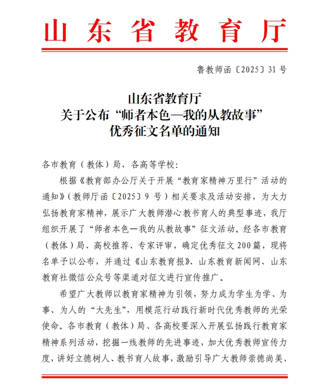 本次“师者本色——我的从教故事”征文活动由山东省教育厅组织开展,围绕理想信念、道德情操、育人智慧等六个主题,经各市教育(教体)局、高校推荐,专家评审,共确定优秀征文200篇,其中高等教育组103篇。获奖作品将通过《山东教育报》、山东教育新闻网、山东教育社微信公众号等渠道对征文进行宣传推广。