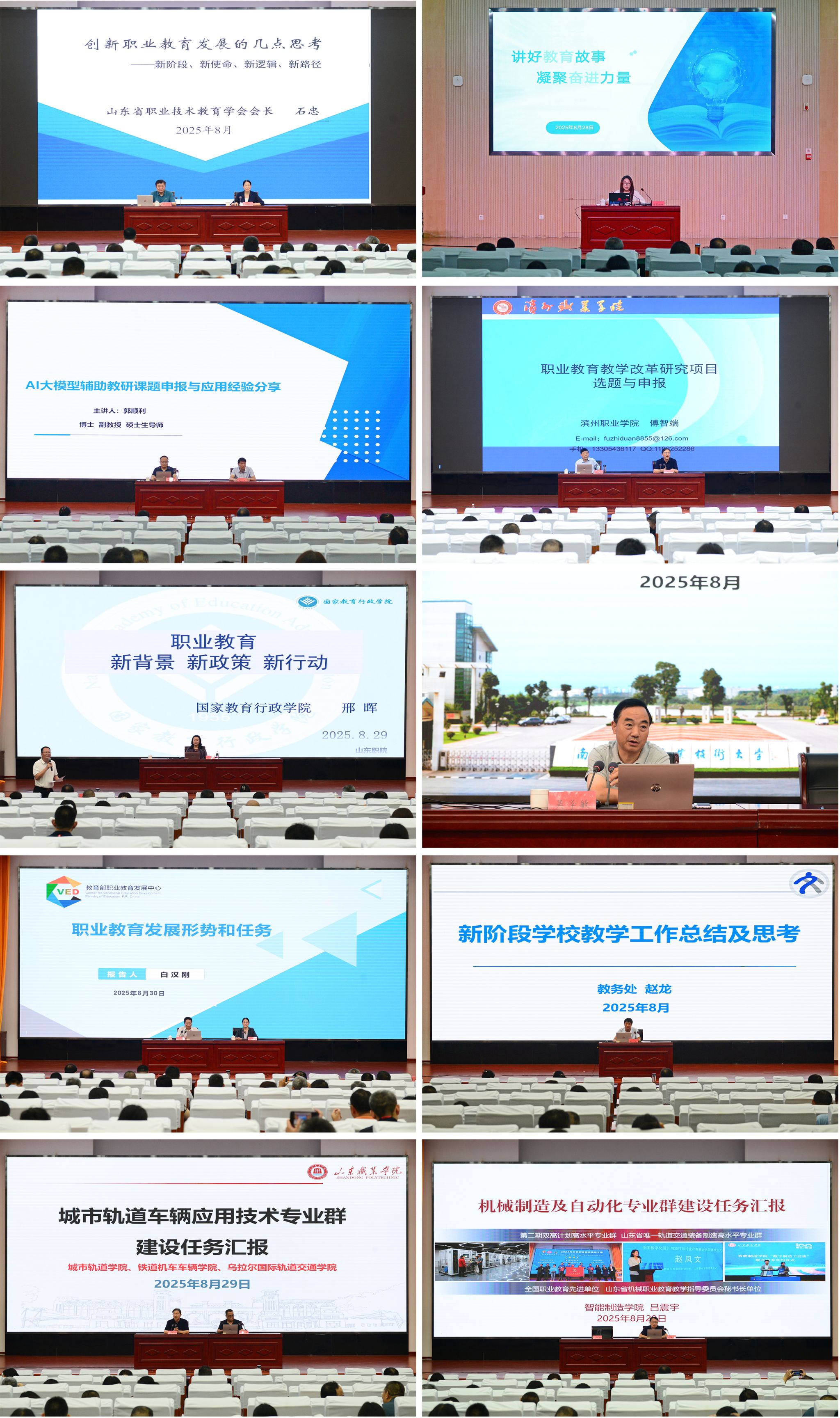 山东省职业技术教育学会会长石忠以《创新职业教育发展的几点思考》为题,系统阐释了职业教育在新阶段的使命定位与创新路径。国家教育行政学院学术委员会原主任邢晖深入解读国家职业教育最新政策,梳理高质量发展背景下的行动方向。南京工业职业技术大学原党委书记吴学敏详细分析了职业教育发展的机遇与挑战和人才培养体系构建的具体路径。教育部职业教育发展中心战略发展处处长白汉刚聚焦当前职业教育的形势与核心任务,分析解读了未来改革发展的重点。山东省教育厅新闻中心主任诸葛佳琳系统讲解了公文写作技巧与教育宣传能力提升策略。曲阜师范大学教授郭顺利介绍了如何借助大模型技术助力教改课题申报,为科研创新提供新思路。滨州职业学院原教务处处长傅智端结合多年评审经验,全面梳理了教改课题的撰写规范与申报逻辑。此外,我校骨干教师分享了“101工程”及专业群建设方面的实践经验,展现了学校在关键领域的推进成果。