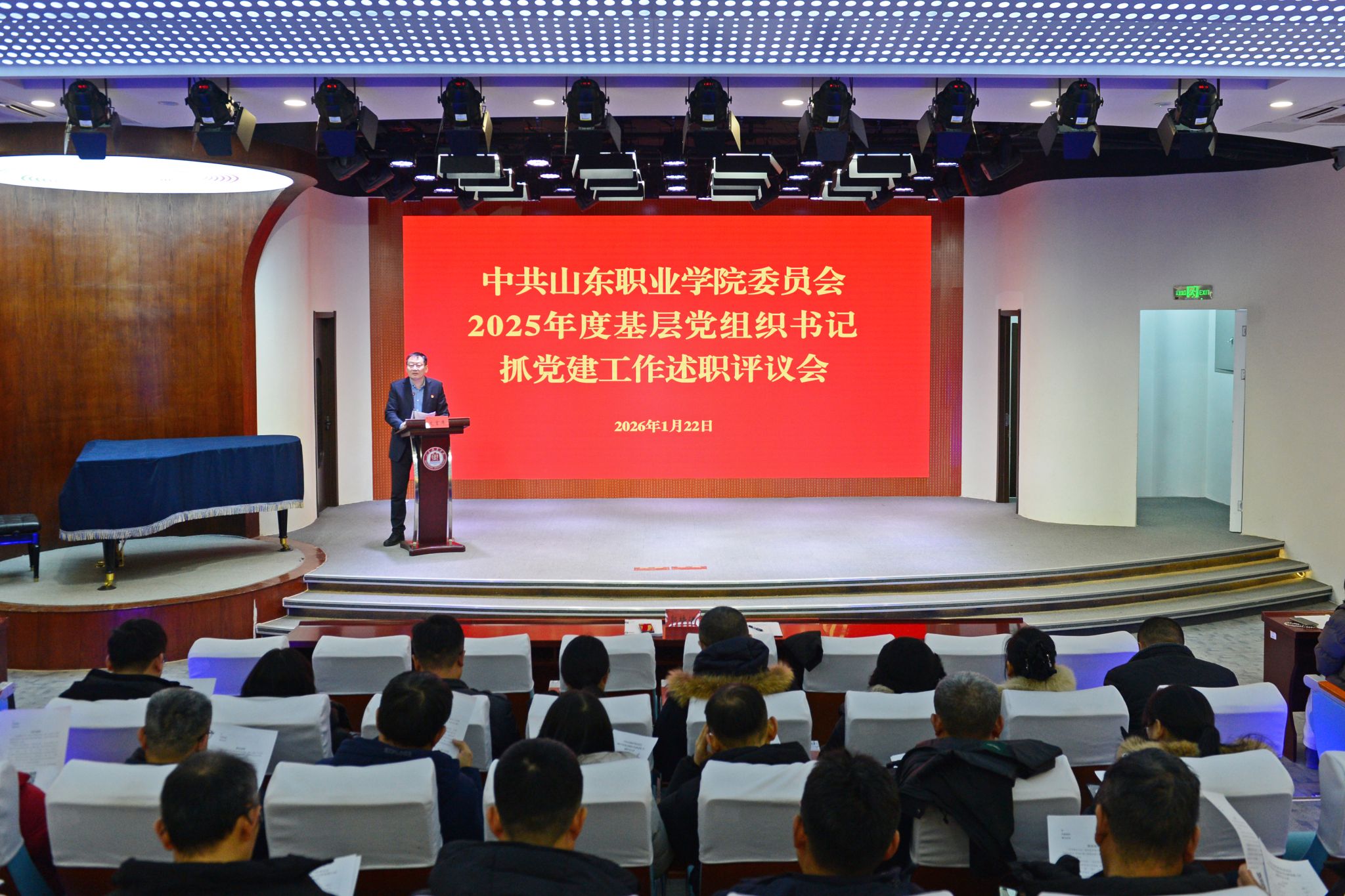 1月22日,我校在3号楼音乐厅召开2025年基层党组织书记抓党建工作述职评议会。学校党委领导班子成员,各党组织书记,院部党组织专职副书记、直属党支部副书记,党员代表参加会议。会议由党委副书记、院长郭培谦主持。