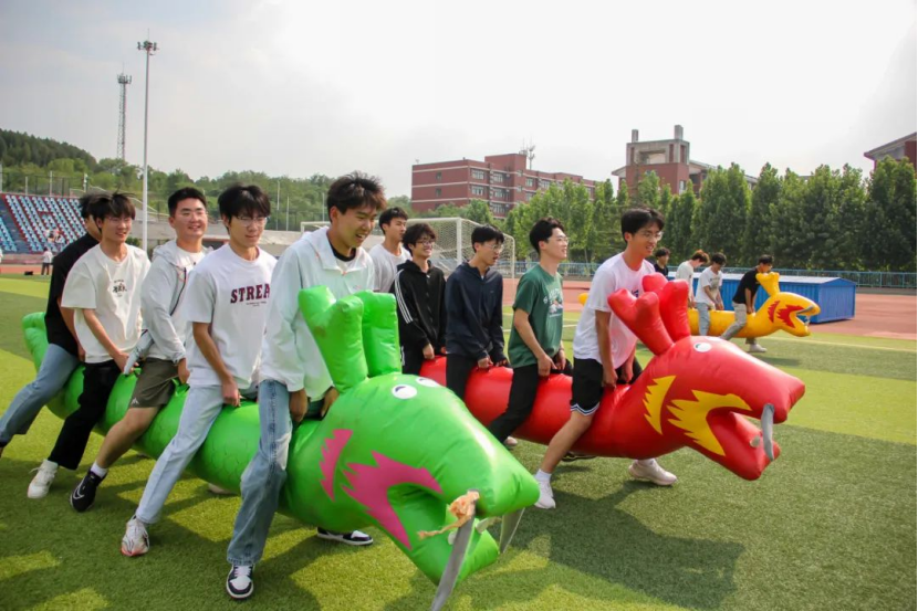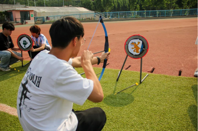 在东操场,同学们进行了一场传统游戏竞技活动。同学们站在靶盘前,用特制的软箭射向靶盘上的“五毒”图案,大家屏气凝神,瞄准靶心,每一次箭矢离弦都伴随着紧张与期待,在感受传统游戏乐趣的同时也体会到了传统习俗的深厚内涵。同学们手握“旱地龙舟”把手,在赛道上竞速。每支队伍在比赛中团结协作,展现了良好的团队精神和竞争意识,他们步伐一致,口号嘹亮,尽情享受着这场充满活力与挑战的运动盛宴。