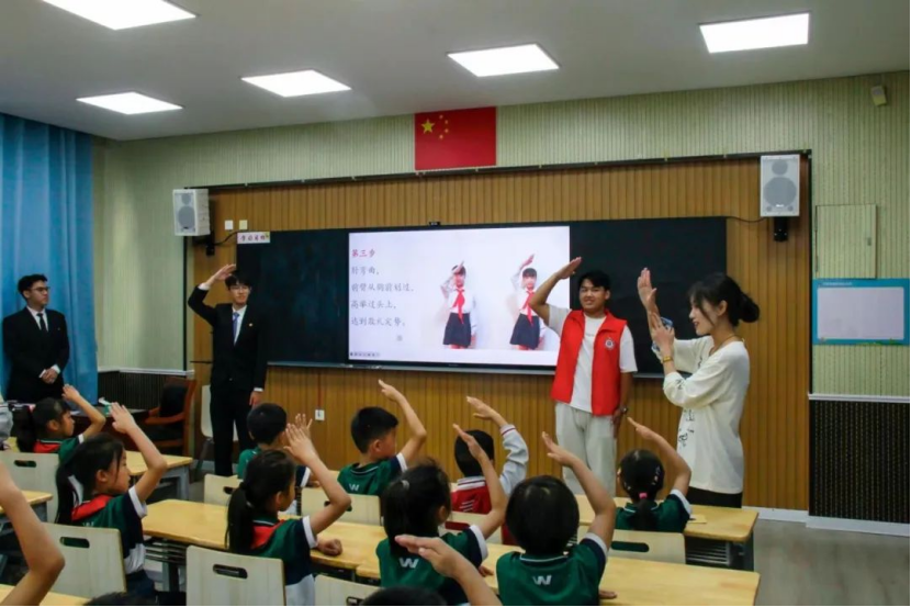 理论宣讲环节,志愿者们向小学生介绍了中国少年先锋队的历史、名称含义及先锋模范人物事迹,阐释了“先锋”作为榜样和前进力量的象征意义。志愿者们还向孩子们展示了中国少年先锋队队旗与队徽,现场指导孩子们如何正确佩戴红领巾,并带领他们学习了呼号、入队誓词以及队礼与队歌。在互动环节,志愿者们精心设计了提问、游戏和实践体验等多样化的活动形式。整个互动过程既生动有趣,又富有教育意义,充分调动了孩子们的参与热情,让他们在轻松愉快的氛围中收获知识与快乐。