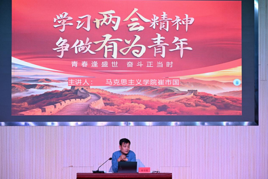 崔市国紧扣“青‘听’2026”“青‘创’2026”“青‘行’2026”三大主线,分层次、多角度开展宣讲。在“青‘听’2026”环节,他系统回顾了“十四五”时期经济社会发展取得的重大成就,通过GDP稳步增长、城镇新增就业突破千万人及新能源汽车产业蓬勃发展等翔实数据与典型案例,深入阐释了国家发展的坚实底气。在“青‘创’2026”部分,结合当前数字经济与智能产业的发展趋势,强调青年是推动创新的重要力量,鼓励学生立足专业实际,将个人成长与国家发展同频共振。在“青‘行’2026”实践环节,组织师生集中观看红色专题片《征程》,并号召大家在课堂上精进技能、在生活中涵养品格、在实践中勇挑重担,争做堪当民族复兴大任的新时代实干家。