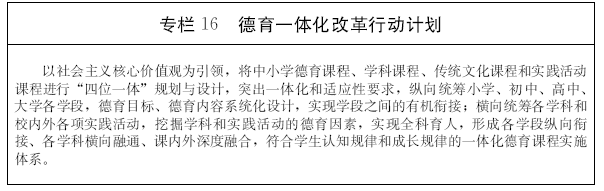 (一)全面实施德育综合改革。以立德树人为根本,以理想信念教育为核心,以社会主义核心价值观为引领,以责任、创新、实践为重点,构建大中小学德育一体化体系,培养又红又专、德才兼备、全面发展的中国特色社会主义合格建设者和接班人。1.建立大中小学德育一体化体系。以政治认同、国家意识、文化自信、公民人格为重点,突出社会主义核心价值观教育,遵循不同年龄阶段学生思想品德形成发展规律和德育工作规律,明确和规范各教育阶段德育目标,实现德育整体性与阶段性、现实性与导向性的统一。发挥学校在德育工作中的主渠道作用,形成学校、家庭、社会紧密配合的德育网络。积极开展校外德育实践活动,完善中小学生社会实践活动机制,在高等学校实施实践育人共同体建设计划。2.构建学段衔接、学科融通的德育课程体系。整合中小学德育课程资源,促进国家、地方和学校德育课程有机统一,提高主题课程和社会实践活动课程比例。构建思政育人、文化育人、专业育人、实践育人“四位一体”的高校德育体系。深入推进高校思想政治理论课建设。发挥山东优秀传统文化资源优势,加强优秀传统文化人才培养,突出儒学文化品牌,形成山东学生德育特色。强化全科育人功能,将德育目标融入各学科课程,促进德育和智育、体育、美育有机融合。3.改进学生德育评价方式和评价机制。建立由教育部门、团委、少工委、学校、社会各界及教师、学生、家长共同参与的中小学德育工作评价机制。注重过程评价,充分体现德育评价的鼓励性、引导性和纠偏性功能,完善中小学生德育评价指标,建立道德认知与道德行为相统一的学生德育评价体系,将中小学生参加公益活动、职业体验实习等实践活动纳入学生综合素质评价。探索建立以价值判断和分析思辨能力为目标、课堂考核与日常行为考核相结合的大学生考试评价方式与体系。4.全面提升教师的德育意识和能力。完善全员育人机制,推行教师“一岗双责”制。加强中小学教师全员德育工作培训,开发基于课程标准的学科教师德育培训和研修课程。建立学科教师德育教研制度。