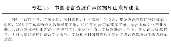 (七)加强语言文字工作。完善语言文字法规规章体系,加强执法调研和检查。大力推广普及国家通用语言文字,推进城市和区域语言文字规范化达标,开展语言文字规范化督导评估。推进重点行业系统语言文字规范化工作。积极开展语言文字应用能力培训,推广使用国家通用手语、盲文。采取有力措施保护利用山东语言资源。