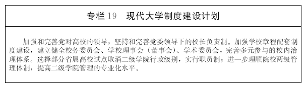 (四)建立现代学校制度。推进政校分开、管办分离,建设依法办学、自主管理、民主监督、社会参与的现代学校制度,构建政府、学校、社会之间新型关系,全面推进教育治理体系和治理能力现代化。1.深入推进管办评分离。构建政府依法管理、学校依法自主办学、社会各界依法参与和监督的教育公共治理新格局。加快转变政府职能,明确职责权限,完善教育分级管理体制。综合运用法律、政策、规划、财政、标准、信息服务等措施,监督和规范学校办学。创新提供公共教育服务方式,健全政府购买教育服务机制。严格控制各类项目评审、教育评估、人才评价和检查事项。培育高资质、高信誉的第三方专业教育服务机构,探索向社会专业机构购买服务,提高公共教育服务质量和效率。2.完善学校治理结构。建立现代大学制度,加强和完善党对高校的领导,坚持和完善普通高校党委领导下的校长负责制。高校党委对本校工作实行全面领导,履行管党治党、办学治校的主体责任,切实发挥领导核心作用。建立健全校务委员会、高校理事会(董事会)制度,依法设立学术委员会,开展二级学院取消行政级别改革试点。不断提升职业院校管理水平,建立适应产教融合的内部治理结构。全面取消中小学校行政级别,完善校长负责制,实行校务会议制度,加强教职工代表大会、学生代表大会制度建设,推进中小学校长职级制改革,实现校长的专业化、职业化。完善校务信息公开制度,建立校内民主管理和监督机制,构建社会支持和监督学校发展的长效机制。3.创新教育评价制度。引导和支持学校发挥教育质量保障主体作用。推进中小学教育质量监测和综合评价,实施中等职业学校学业水平考试。开展职业院校教育教学评估工作。建立全省高校本科教学基本状态数据库,推动高校内部建立相应的数据库,依托数据开展高校质量监控与评价。探索委托第三方开展教育评价。鼓励高校积极参与国家或国际组织实施的教育质量评估项目。实施高等学校综合评价改革。完善高校人才培养质量年度报告和毕业生就业质量报告发布制度。
