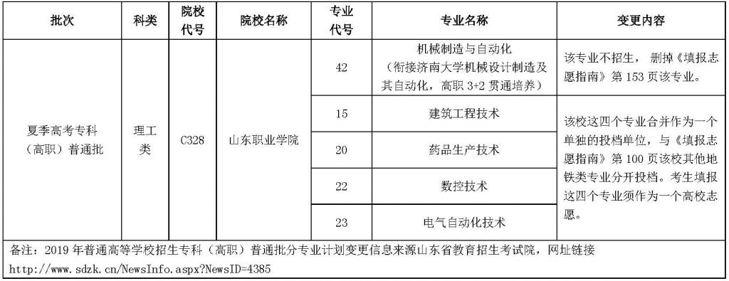 山东职业学院2019年普通高等学校招生专科(高职)普通批分专业计划变更